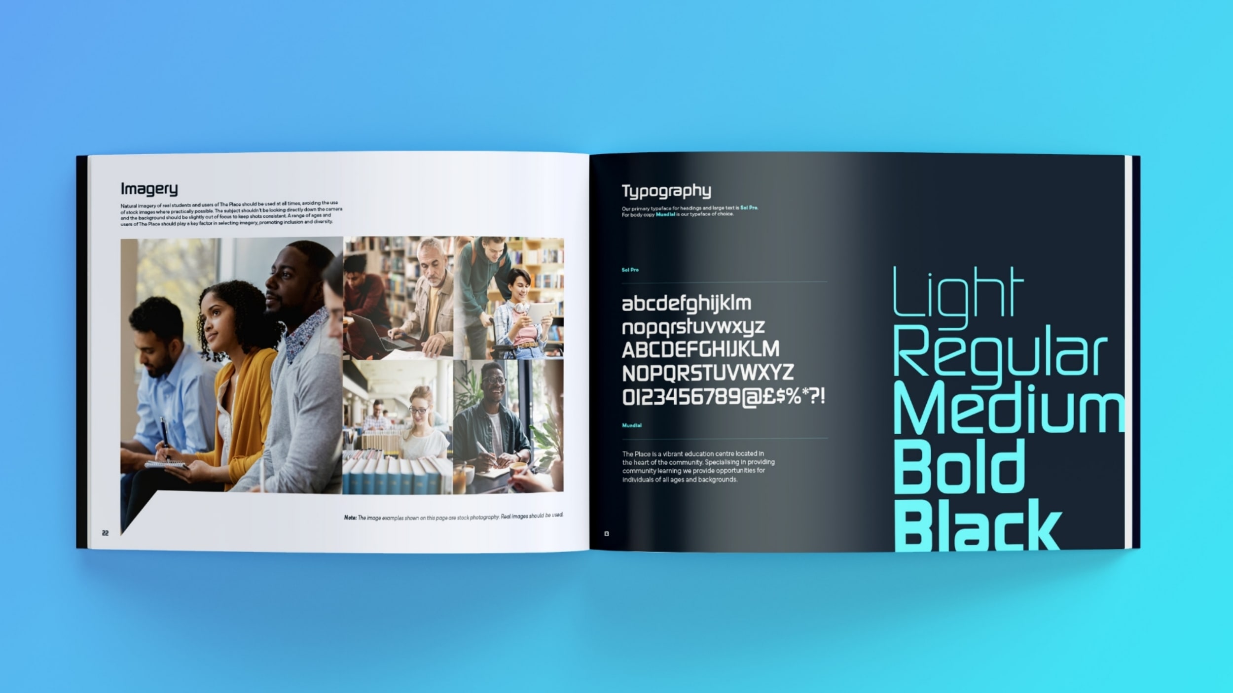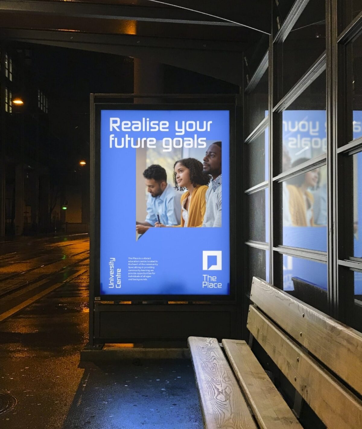 This meticulous process led to the birth of The Place, a new brand. The final identity features an abstract ‘P’ symbolising both conversation and location, combined with a bold, contemporary, friendly, and open typeface. This design reinforces the message that education is for all, regardless of background, beliefs, or accessibility requirements. We also delivered a comprehensive brand book detailing application and usage rules to ensure consistency, alongside a suite of messages for social media and advertising, such as “Realise your future goals” and “The Place where everyone has the opportunity to learn.”